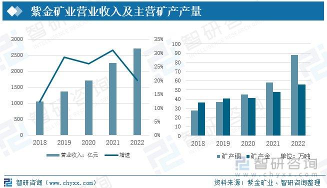 紫金礦業(yè)是一家在全球范圍內從事銅、金、鋅、鋰等金屬礦產(chǎn)資源勘查、開(kāi)發(fā)及工程設計、技術(shù)應用研究的大型跨國礦業(yè)集團,是中國控制金屬礦產(chǎn)資源最多的企業(yè)之一。紫金礦業(yè)營(yíng)業(yè)收入近年來(lái)保持高速增長(cháng)的趨勢,2022年紫金礦業(yè)營(yíng)業(yè)收入為2703億元,較2021年增加20%。2019年之前,紫金礦業(yè)礦產(chǎn)金的產(chǎn)量大于礦產(chǎn)銅的產(chǎn)量,2020年開(kāi)始,紫金礦業(yè)開(kāi)始大力發(fā)展礦產(chǎn)銅,礦產(chǎn)銅的產(chǎn)量實(shí)現高速增長(cháng),2022年,礦產(chǎn)銅的產(chǎn)量為88萬(wàn)噸,較2021年增加30萬(wàn)噸,同比增加51.72%。
