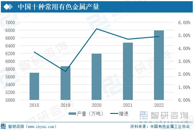 據中國有色金屬工業(yè)協(xié)會(huì )發(fā)布的數據統計,受下端需求拉動(dòng)及消費量增加的影響,我國十種常見(jiàn)有色金屬的產(chǎn)量呈現逐年增加的趨勢,且增速較高。2022年十種常用有色金屬產(chǎn)量為6793.6萬(wàn)噸,較2021年同比增加4.90%。