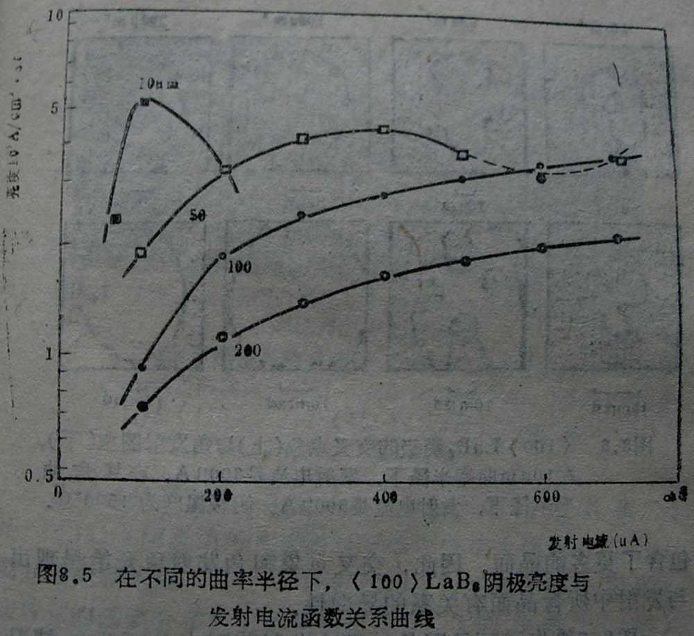 實(shí)驗指出,尖端曲率相當小時(shí),可以得到低功函數LaB6所希望有的高亮度。但在長(cháng)期工作時(shí)間內,小曲率半徑的陰極僅僅在經(jīng)過(guò)較短的工作時(shí)間后,尖端的小球面消失。100μm的大曲率半徑在超過(guò)1500小時(shí)后,仍能保持垂直于光軸的(100)面,因而提供了相當穩定的發(fā)射。