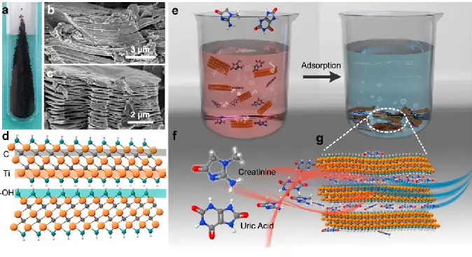 美國德雷塞爾大學(xué)Yury Gogotsi教授團隊[6]將Ti3C2Tx,一種已知能有效吸附尿素的MXenes材料,用于從水溶液和透析液中去除肌酐和尿酸,最大吸附量分別為45.7和17.0 mg g-1。作者系統地分析和模擬了吸附動(dòng)力學(xué)、等溫線(xiàn)和熱力學(xué),從而確定了限速步驟和吸附機理,并設計了一個(gè)裝有Ti3C2Tx的固定床柱,以進(jìn)一步評估連續流體流動(dòng)條件下的吸附性能,反映連續腎臟替代治療方法的條件。該研究表明,Ti3C2Tx具有作為透析液再生的有效吸附劑的潛力,通過(guò)去除過(guò)濾的毒素加速透析液再生,實(shí)現更便攜的透析設備制造,體現出MXenes材料在醫藥領(lǐng)域的應用潛力(圖8)。