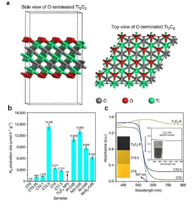 如上圖6所示,喬世璋課題組[4]通過(guò)DFT理論計算指導合成了一種具有高效共催化性能的MXene材料:Ti3C2納米顆粒。研究人員通過(guò)水熱法將Ti3C2納米顆粒集成到吸光材料CdS表面,實(shí)現了活性高達14342 μmol h-1 g-1的可見(jiàn)光催化產(chǎn)氫,且在420 nm處表觀(guān)量子效率為40.1%(圖6 b)。該研究成果首次將MXene作為共催化劑引入到光解水產(chǎn)氫體系中,證明了MXene在取代Pt,構建低成本、高性能光電極或者光催化劑方面展現出來(lái)的巨大潛力。