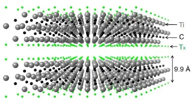 因此,在氫氟酸溶液中,MAX相的A原子層易于被刻蝕,剩下M與X原子層形成二維Mn+1Xn原子晶體,為了強調它們是由MAX相剝離而來(lái),并具有與石墨烯(Graphene)類(lèi)似的二維結構,將它們統一命名為MXene。根據各種過(guò)渡金屬(如Ti,Mo,V,Cr及其與C和N合金)的組合,材料科學(xué)家已經(jīng)確定或預測了成百上千種不同MXenes的穩定相。