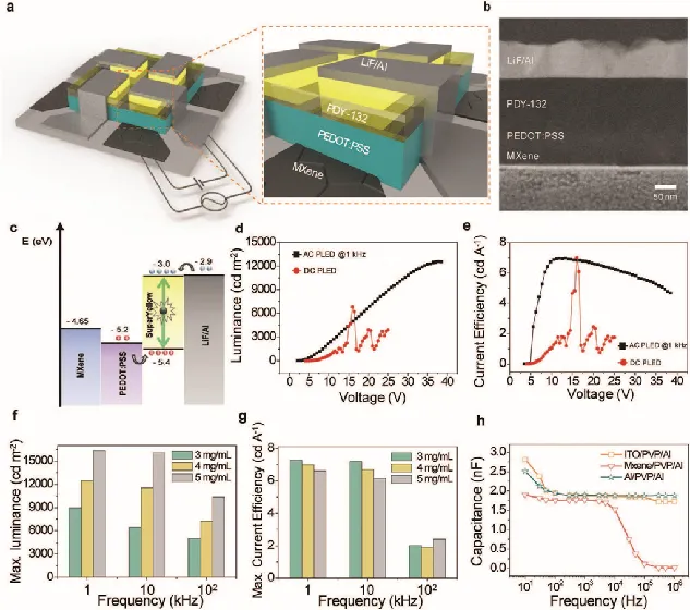 (f-g)最大亮度和電流效率與頻率的關(guān)系;(h)不同電極的電容