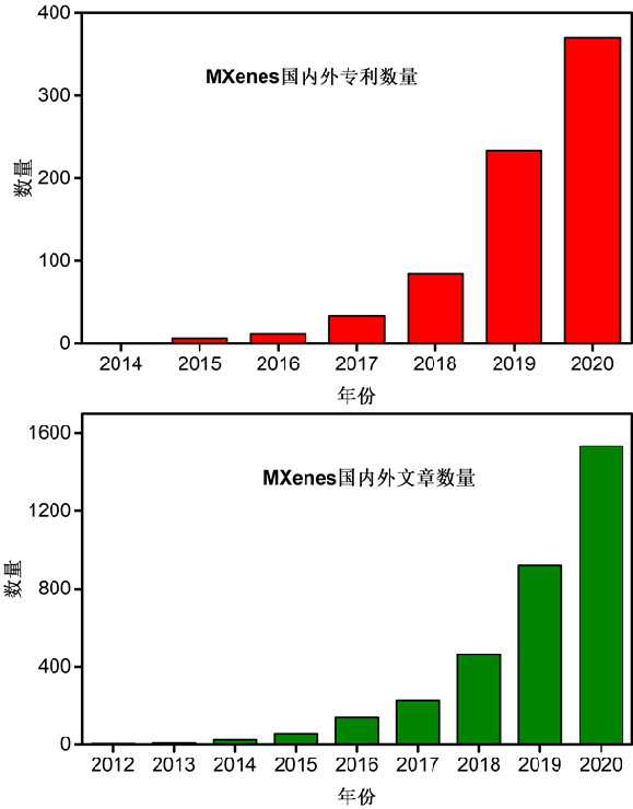 圖2 從“Web of Science”網(wǎng)站統計與MXenes相關(guān)的文章及國內外專(zhuān)利數量