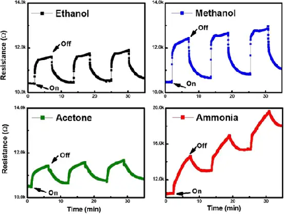 奧本大學(xué)Dong-Joo Kim教授[7]第一次報道了基于Ti3C2Tx的氣體傳感器,并籍此測試了乙醇、甲醇、丙酮和氨氣。作者將合成的Ti3C2Tx納米薄片用易操作的溶液澆鑄法制備在柔性聚酰亞胺薄膜上,并對其表面化學(xué)性質(zhì)進(jìn)行了研究。如圖9所示,Ti3C2Tx傳感器在室溫下成功地檢測了乙醇、甲醇、丙酮、氨氣等氣體,表現出p型傳感行為。由于Ti3C2Tx傳感器具有較大的吸收能量,因此對氨氣有較高的傳感響應。根據傳感材料與傳感材料之間的相互作用產(chǎn)生的多數電荷載流子轉移,提出了該傳感器可能的傳感機理。這種新型的Ti3C2Tx氣體傳感器將是未來(lái)可穿戴電子設備的新一代通用傳感器,其性能可與其他2D材料傳感器相媲美,這也為MXenes材料在傳感器方面的應用提供了一個(gè)新的方向。