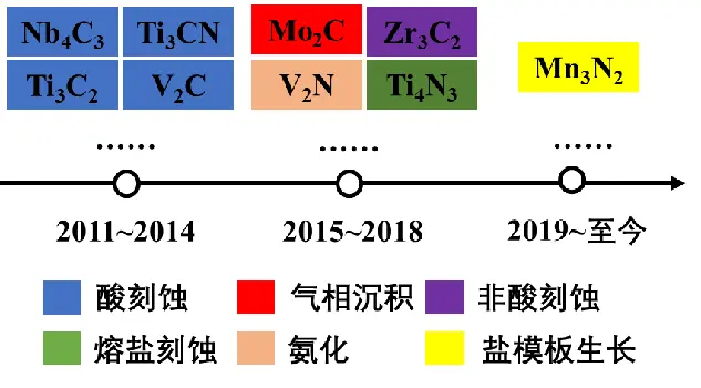 隨著(zhù)MXenes家族的壯大,對MXenes材料的研究也日益增多。圖3羅列了發(fā)現MXenes材料的進(jìn)展的簡(jiǎn)要時(shí)間表??梢钥吹浇鼛啄闙Xenes材料的發(fā)展速度越來(lái)越迅速,并且可以從圖中看到制備MXenes材料的工藝流程也越來(lái)越豐富,逐漸從使用高毒性和高腐蝕性的HF溶液發(fā)展到通過(guò)熔融鹽、高溫堿溶液和電化學(xué)方法剝離等更豐富更綠色健康的方法和工藝[2]。