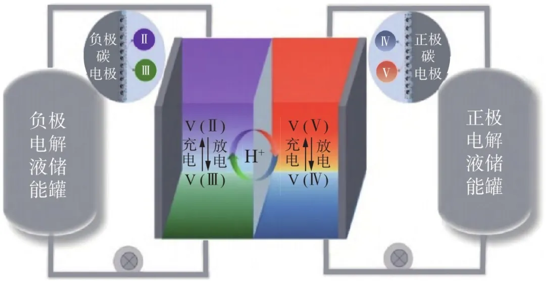 全釩氧化還原液流電池,簡(jiǎn)稱(chēng)釩電池(Vanadium redox battery, VRB)由澳大利亞Skyllas-Kazacos在1985年首次提出,國內中科院大連化學(xué)物理研究所從2005年開(kāi)始VRB的研究。釩電池儲能系統由正、負極碳電極,正、負極電解液儲能罐,離子交換膜組件等構成,其示意圖如圖5所示。釩電池具有可瞬間充電、大功率、大容量、安全性高等優(yōu)點(diǎn),能解決大規模新能源發(fā)電并網(wǎng)需要、合理配置儲能系統,滿(mǎn)足大容量電能的存儲和轉換對儲能電池的特殊需求。因而釩電池“當仁不讓”地成為新能源儲能、電網(wǎng)調峰、備用電源等領(lǐng)域的首選,被形象的稱(chēng)為儲能“銀行”。據《中國釩電池行業(yè)發(fā)展白皮書(shū)(2022年)》預計,2025年釩電池新增規模將達到2.3 GW,2030年將達到4.5 GW,當年新增市場(chǎng)規模約405億元。