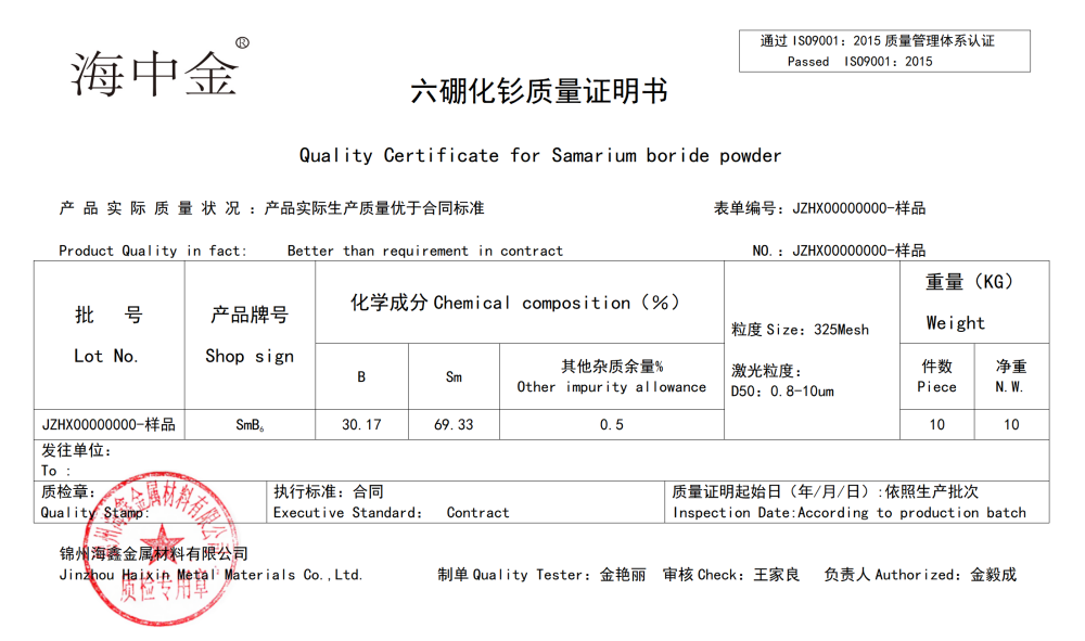 產(chǎn)品名稱(chēng):六硼化釤(SmB6)